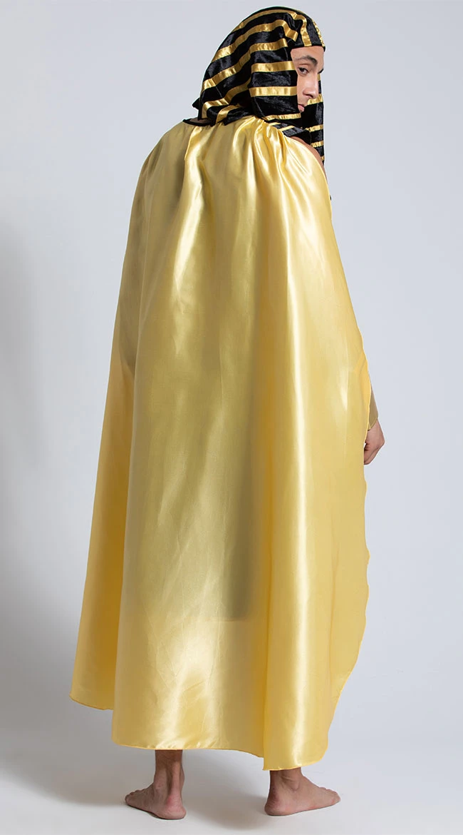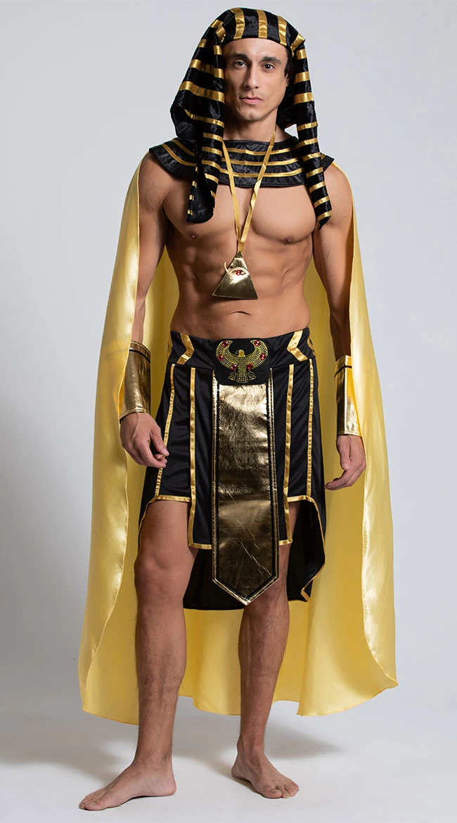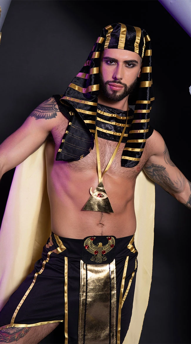Look perfect next to your Cleopatra in this King of Egypt costume featuring an Egyptian collar with an attached gold cape, gold wrist gauntlets, striped Egyptian head piece, Eye of Horus necklace and traditional Shendyt skirt with an embellished waistband. Can be worn with or without a shirt!