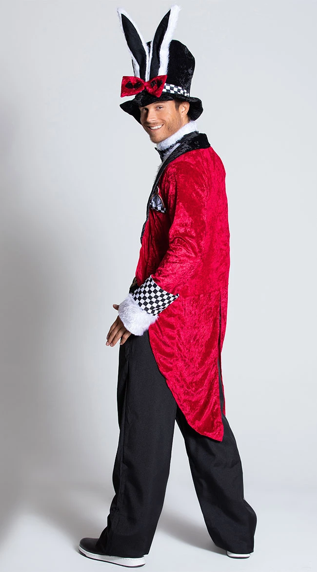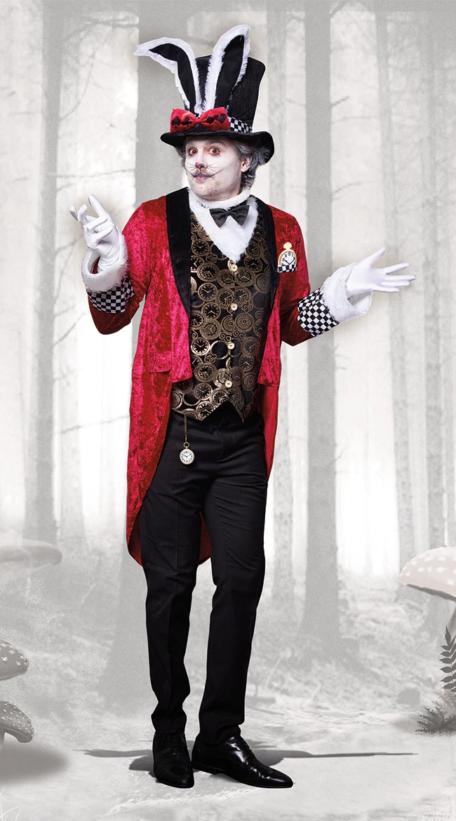 Travel through the looking glass in this Men’s White Rabbit costume featuring a red velvet jacket with black tuxedo styled lapels, breast pocket checkered detailing and stop watch embellishment, fur and checkered lined cuffs, gold pocket watch accented black vest with accented fur and black bow tie, gold and white pocket watch, collapsible black velvet hat with checkered ribbon, red bow, and white and black rabbit ears. (Trousers and Gloves not included).