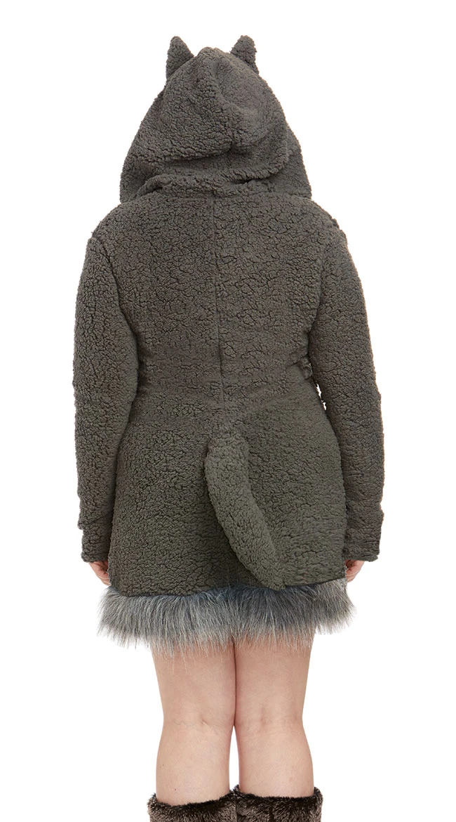 It’s a full moon! Make them howl in this plus size Wild Wolf costume featuring a grey sherpa dress with a front zipper closure, long sleeves, an attached hood with a faux fur trim and ears, and an attached tail. (Wig and boots not included.)