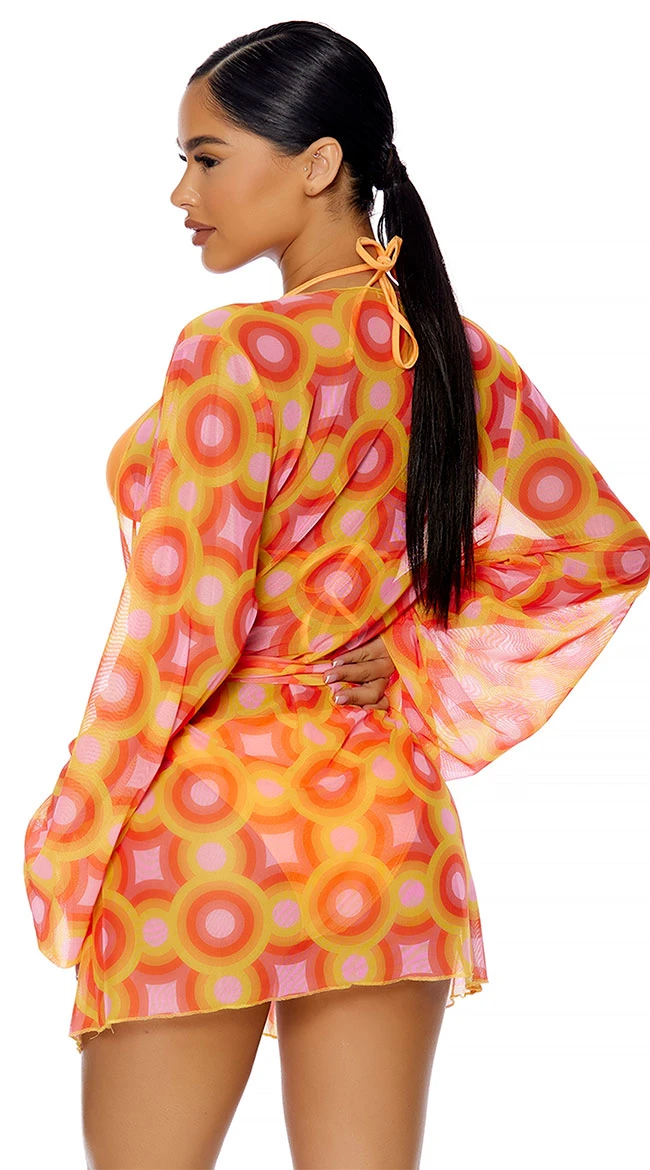 Brighten up your pool day with this sheer, mesh cover-up kimono featuring an allover colorful design, long, loose sleeves, and a matching waist tie. (Swimsuit not included.)