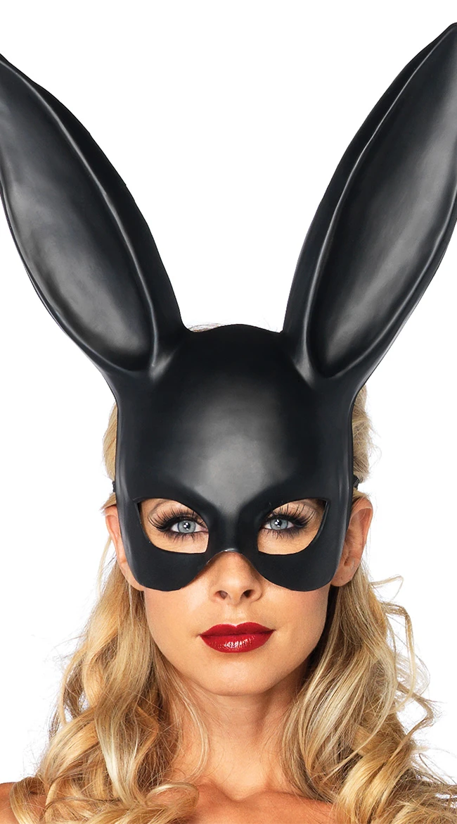 Black, bondage bunny mask with oversized bunny ears and eye cut outs.