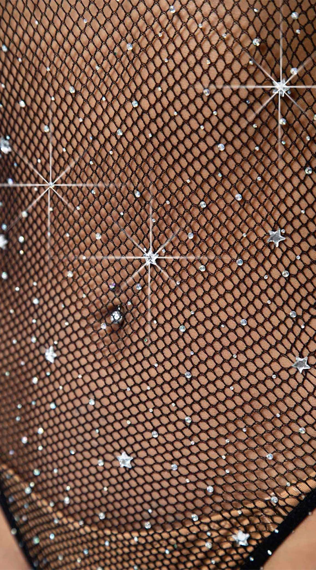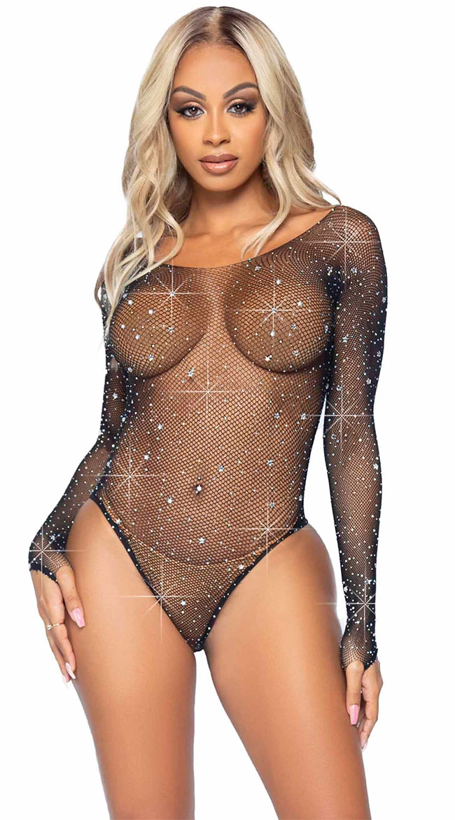 Stun and amaze in this eye catching fishnet teddy featuring sheer cups, a scoop neckline, a sheer bodice with galaxy star rhinestones, long fitted sleeves, a snap crotch closure, and a cheeky cut back.