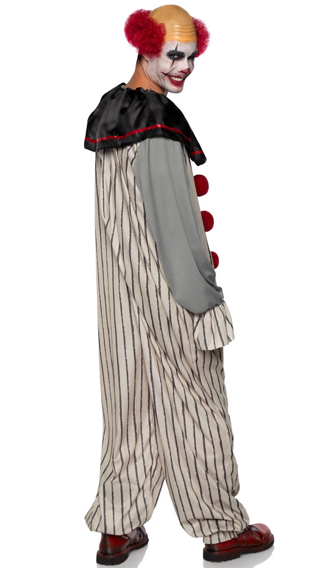 Ready to entertain the children? Parade your way through the circus with a scary laugh in this men’s Creppy Clown costume featuring an over sized striped jumpsuit with pom pom accents, a black satin collar with a red trim, and a red clown wig. (Face makeup and shoes not included.)