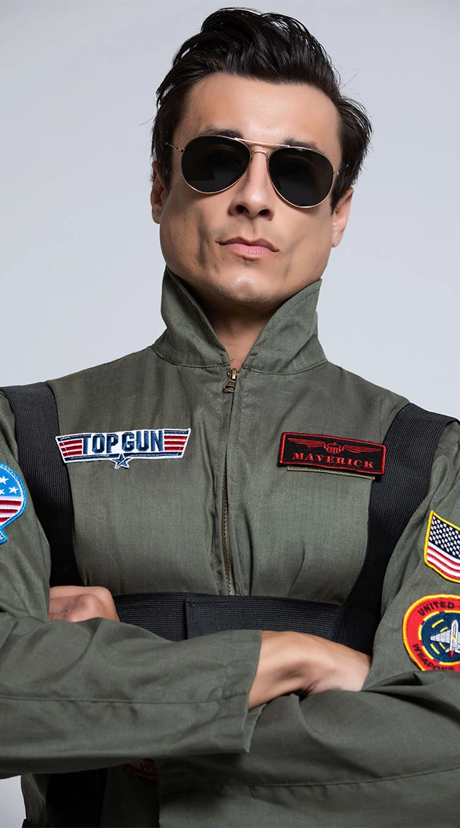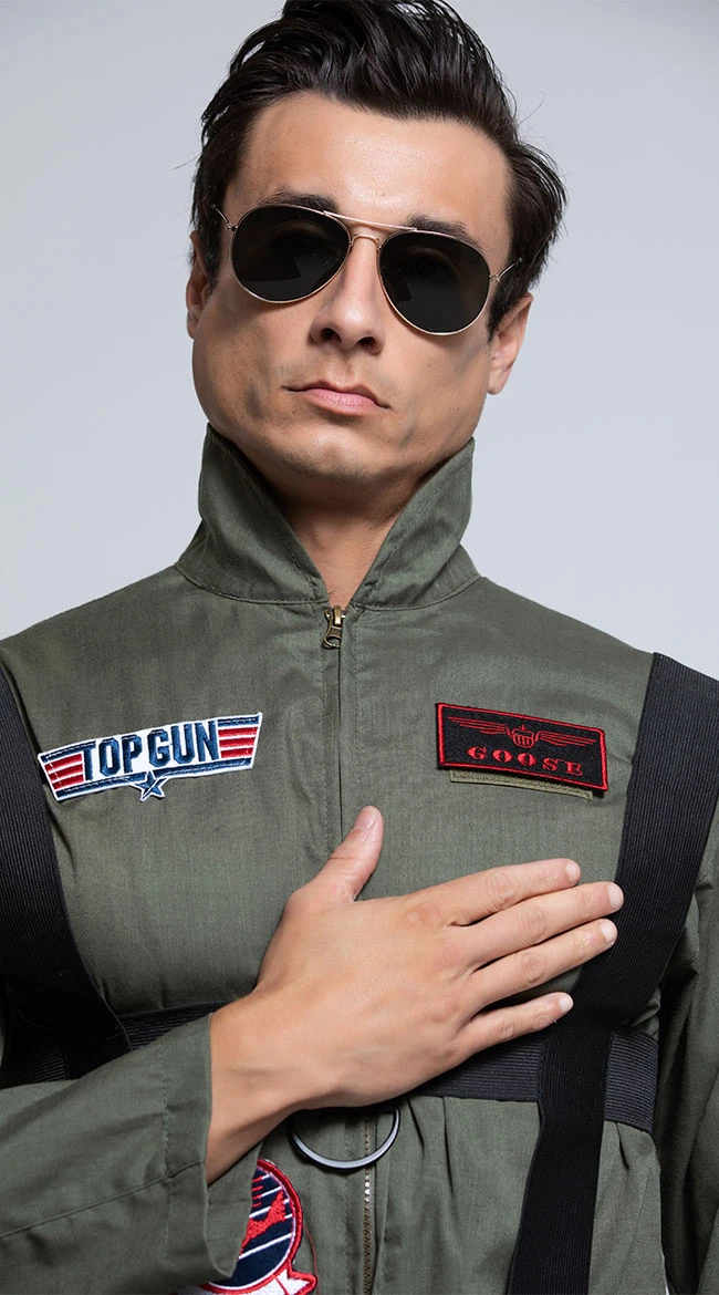 Become the ultimate wingman in this three-piece Men’s Top Gun Paratrooper costume featuring an Army green flight suit with interchangeable badges, air force patches and black harness.