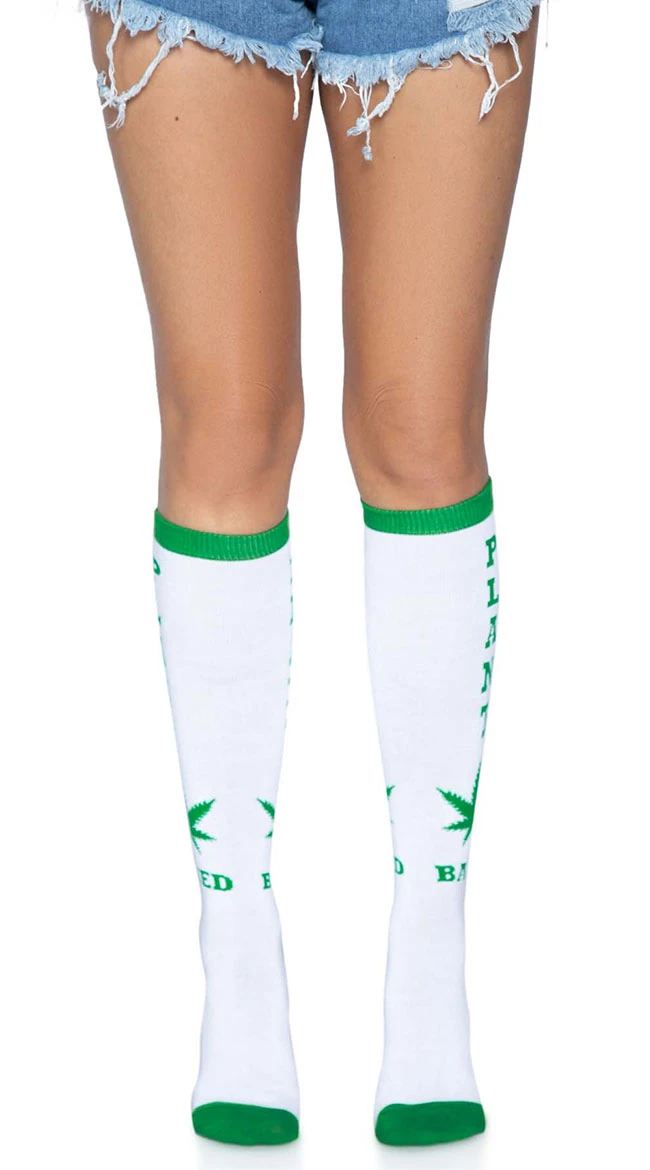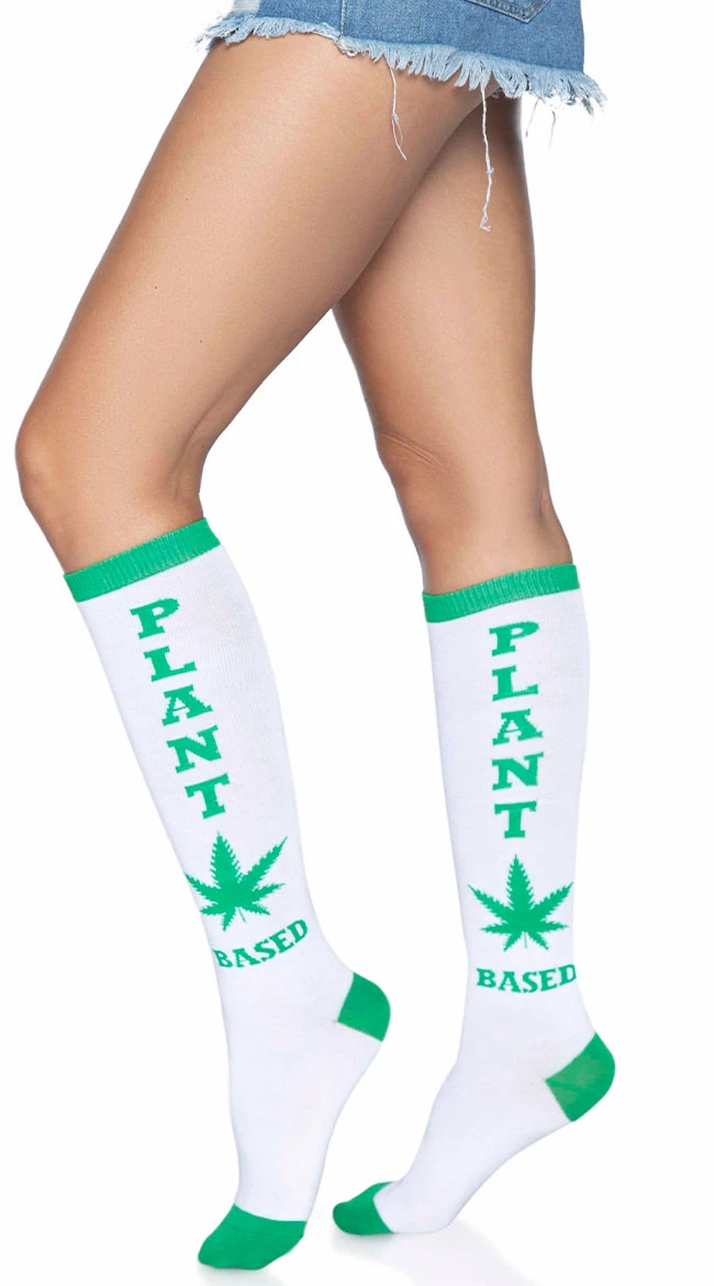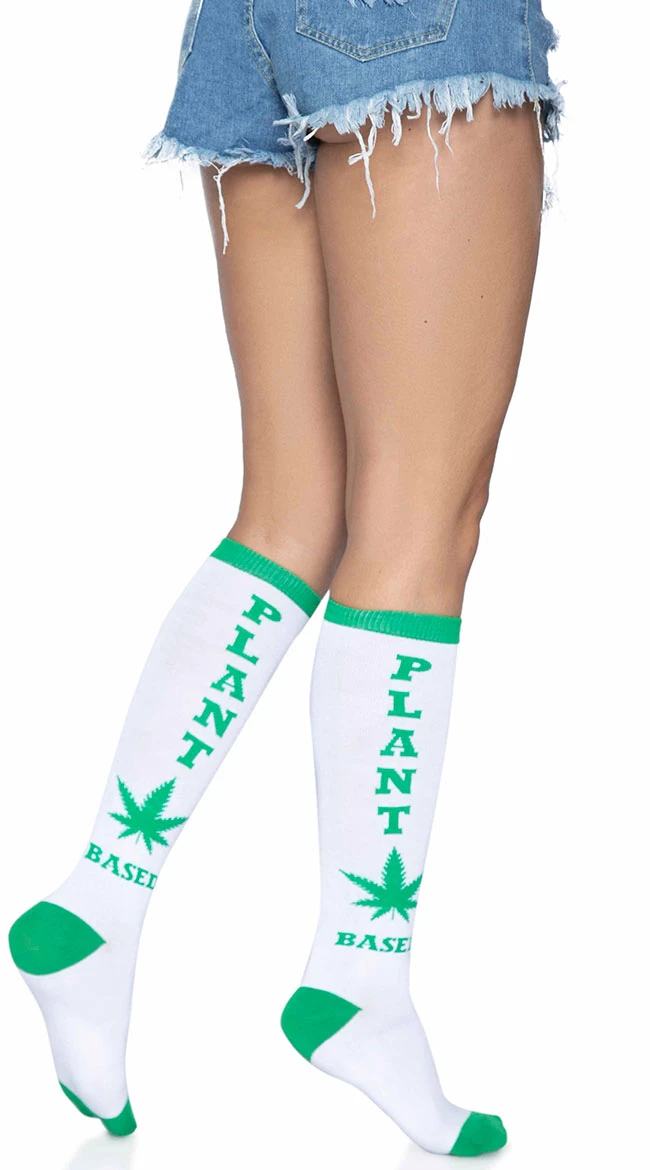Get ready to roll in these white knee high socks featuring a green trim, “PLANT BASED” printed in green with a marijuana leaf decal, and a green tipped heel and toe. (Shorts not included.)