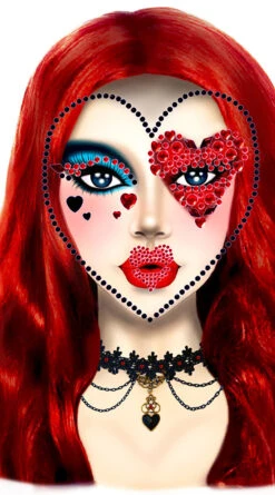 Complete your regal costume with these adhesive face jewels featuring a red heart shaped eye sticker, red and black mini heart stickers, a red dotted cut crease sticker, red heart lip sticker, and a large black heart face sticker. (Face adhesive only.)
