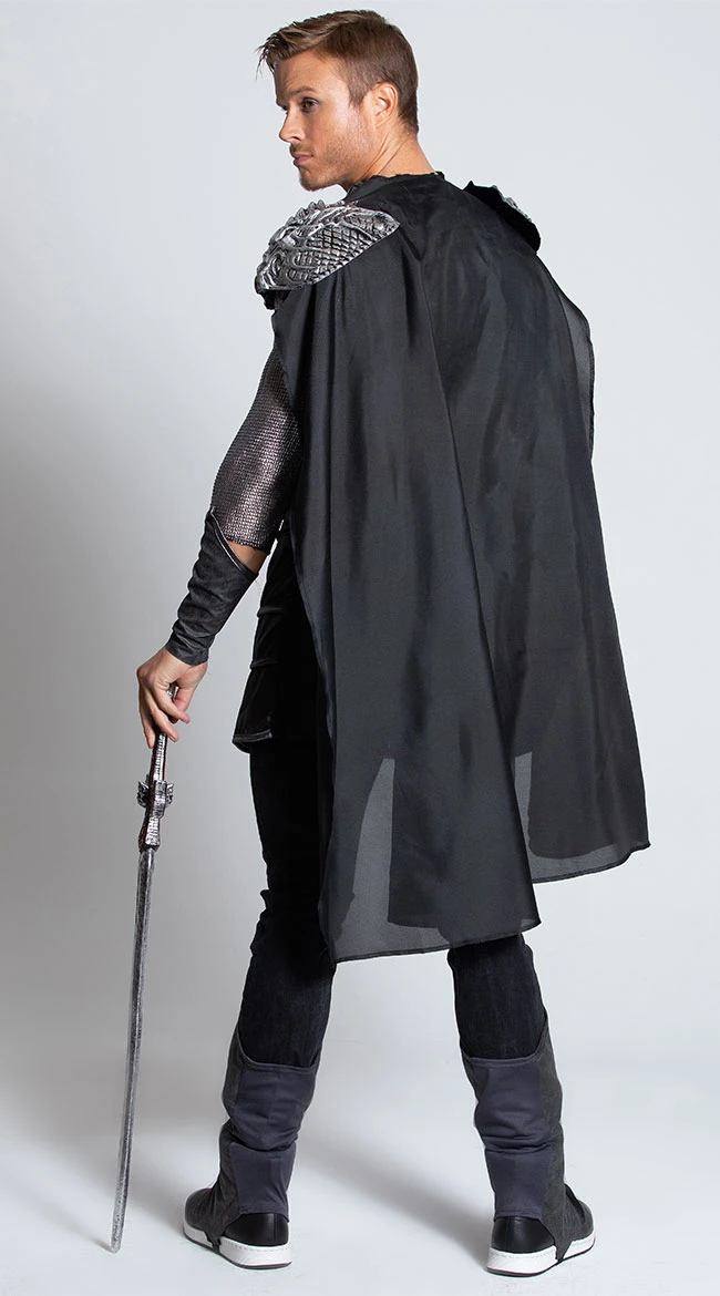 Take down your enemies in this men’s Dark Medieval Knight costume featuring a silver tunic with an armor design, long sleeves with attached cuffs, sculpted chest and shoulder piece, matching cape, a black belt, and matching boot covers. (Pants and sword not included.)