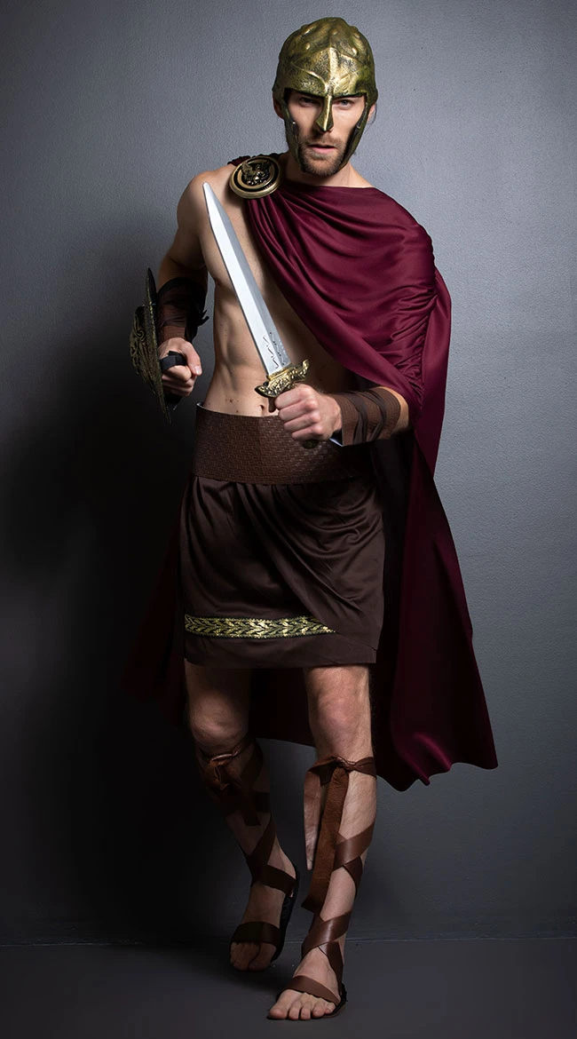 The Men’s Spartan Warrior costume includes a cape with medallion, wrap with belt, helmet and arm cuffs. Sword not included.