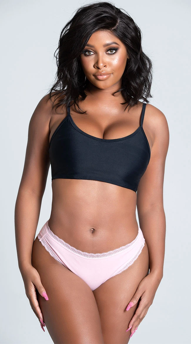 Imagine your sexiest night in this flirty panty featuring an all over soft knit with a delicate lace trim, and a cheeky cut back. (Top not included.)