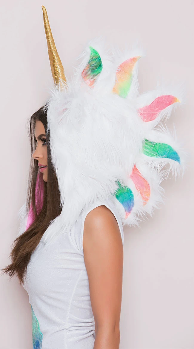 Transform into the majestic being that you are in this exclusive Magical Pastel Unicorn costume featuring a white romper with a front zipper closure, a tie dye pastel bodice panel, a full back, an attached furry hood with a pink lining, attached furry ears with a pastel design, a shimmering gold horn, and a furry pastel mane. (Thigh high stockings not included.)
