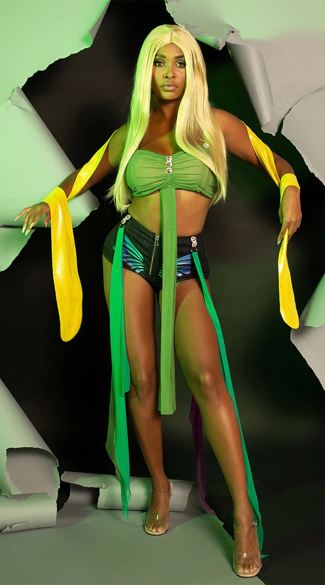 She’s back, Bitch! Are you a slave to sexy? Oops, you did it again, but your die-hard babes aren’t sad about your daring debut. Get caught reminiscing on your ’90s teen stardom in this exclusive Slay For You Superstar costume featuring a green mesh crop top with rhinestone embellishments, adjustable spaghetti straps, matching denim booty shorts with butterfly detailing, a front zipper, rhinestone bejeweled accents with multi-color draping mesh panels, and a yellow slithering snake shoulder drape. (Shoes not included.)